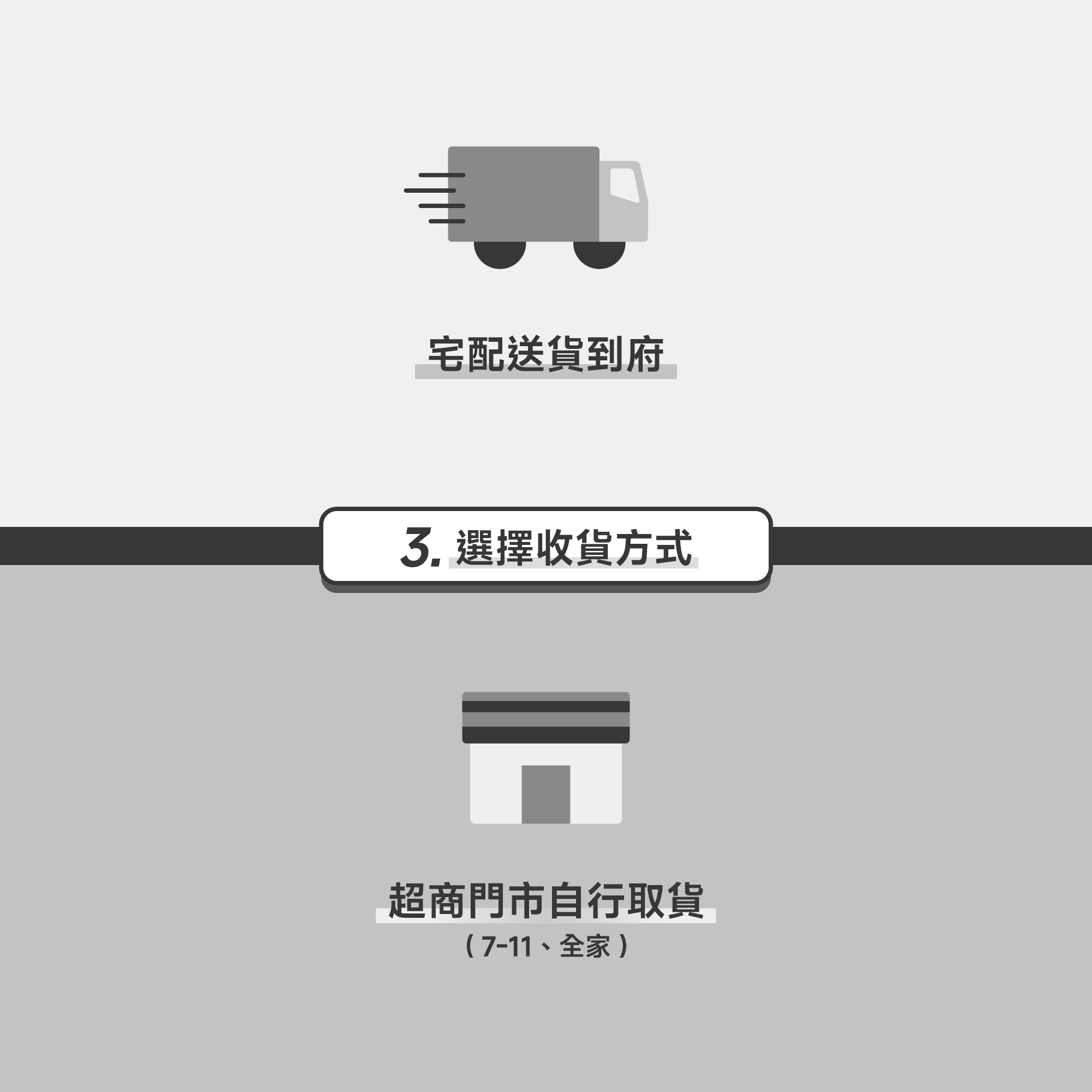 我們提供多種取貨管道。選擇「宅配到家」請於結帳頁面輸入完整收件地址;選擇「超商取貨」請點選地圖以選取 7-11 或全家取貨店面。